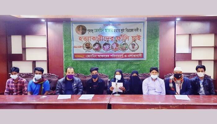 সংবাদ সম্মেলনে আরো জানানো হয়, থানায় গিয়ে জেসমিন হত্যার সুষ্ঠ বিচার না পেয়ে মামলার তদন্তকারী সংস্থা পরিবর্তন চেয়ে গত ১৮ অক্টোবর নিহত জেসমিনের মা ওয়াছ খাতুন আদালতে আবেদন করলে আদালত শুনানী শেষে মামলাটি পিবিআইকে তদন্তভার দেন। এ বিষয়টি জানতে পেরে মামলার ফটিকছড়ি থানা পুলিশ গত ৪ নভেম্বর একটি মনগড়া চার্জশীট আদালতে পাঠান। গত ২ জানুয়ারি এ চার্জশীটের বিরুদ্ধে আদালতে নারাজি দাখিল করেন নিহত গৃহবধু জেসমিনের মা ওয়াছ খাতুন। আদালত নারাজী আবেদন গ্রহণ করে এটি জেলা পিবিআইকে পুনঃতদন্তের আদেশ দেন। বর্তমানে মামলাটি তুলে নিতে আসামীরা মামলার বাদী ও বাদীর পরিবারের সদস্যদের চাপ সৃষ্টিসহ বিভিন্ন ধরণের হুমকি দিয়ে আসছে। ফলে মামলার বাদী ও পরিবারের সদস্যরা নিরাপত্তাহীনতায় ভূগছে। নিহত জেসমিন হত্যা মামলার সুষ্ঠ তদন্ত সাপেক্ষে এ মামলার সব আসামীকে দ্রুত গ্রেফতার ও শাস্তির দাবি জানিয়েছেন বাদী ওয়াছ খাতুন।