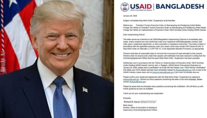 শনিবার (২৫ জানুয়ারি) ইউএসএইডের অধিগ্রহণ ও সহায়তা তত্ত্বাবধায়ক চুক্তি কর্মকর্তা ব্রায়ান অ্যারন স্বাক্ষরিত মার্কিন সহায়তায় কার্যক্রম পরিচালনা করা বাংলাদেশি প্রতিষ্ঠানগুলোর কাছে পাঠানো চিঠিতে এ কথা জানানো হয়।