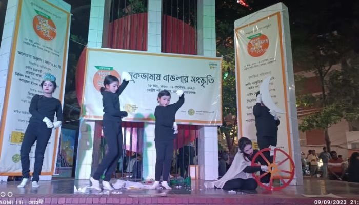 নারায়ণগঞ্জ: বাঙলা মূকাভিনয় গবেষণা কেন্দ্রের আয়োজনে ‘মূক ভাষায় বাঙলার সংস্কৃতি’ শিরোনামে নারায়ণগঞ্জ কেন্দ্রীয় শহীদ মিনারের পাদদেশে শনিবার (৯ সেপ্টেম্বর) সন্ধায় অনুষ্ঠিত হল ‘বাঙলা মূকাভিনয় উৎসব’। সাংস্কৃতিক সংগঠক ধীমান সাহা জুয়েলের সঞ্চালনায় উৎসবে উদ্বোধনী আলোচনা সভায় সভাপতিত্ব করেন যুক্তরাষ্ট্র থেকে স্কাইপিতে যুক্ত হয়ে মাইম আইকন কাজী মশহুরুল হুদা ও স্বাগত বক্তব্য দেন গবেষণা কেন্দ্রের পরিচালক ও সম্পাদক রিজোয়ান রাজন। অতিথির বক্তব্য দেন প্রবীণ সংস্কৃতিজন রথীন চক্রবর্তী, আলোকিতজন রফিউর রাব্বি, চারণ সংস্কৃতিক কেন্দ্রের সভাপতি নিখিল দাস ও নাট্যগবেষক মো. কামরুল হাসান।