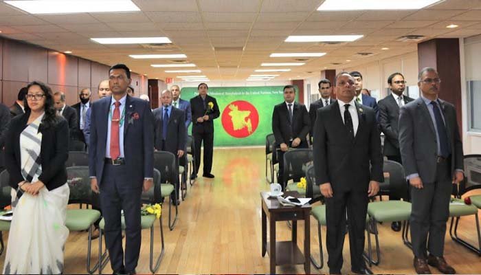 জাতিসংঘ সদর দপ্তরে আন্তর্জাতিক মাতৃভাষা দিবস উদ্যাপন অনুষ্ঠানের আগে সকালে যথাযোগ্য মর্যাদায় জাতিসংঘে বাংলাদেশ স্থায়ী মিশনে মহান শহীদ দিবস ও আন্তর্জাতিক মাতৃভাষা দিবস উদ্যাপনের আয়োজন করা হয়। মান্যবর রাষ্ট্রদূত ও স্থায়ী প্রতিনিধির নেতৃত্বে মিশনের কর্মকর্তা-কর্মচারীগণ মিশনে স্থাপিত অস্থায়ী শহীদ মিনারে পুস্পস্তবক অর্পণ করেন। অনুষ্ঠানটিতে রাষ্ট্রপতি, প্রধানমন্ত্রী, পররাষ্ট্রমন্ত্রী ও পররাষ্ট্র প্রতিমন্ত্রীর বাণী পাঠ করা হয়। সবশেষে জাতির পিতা বঙ্গবন্ধু শেখ মুজিবুর রহমান ও তাঁর পরিবারের শহীদ সদস্যবৃন্দ এবং মহান একুশের ভাষা শহীদদের আত্মার মাগফেরাত কামনা করে বিশেষ মোনাজাত পরিচালনা করা হয়।