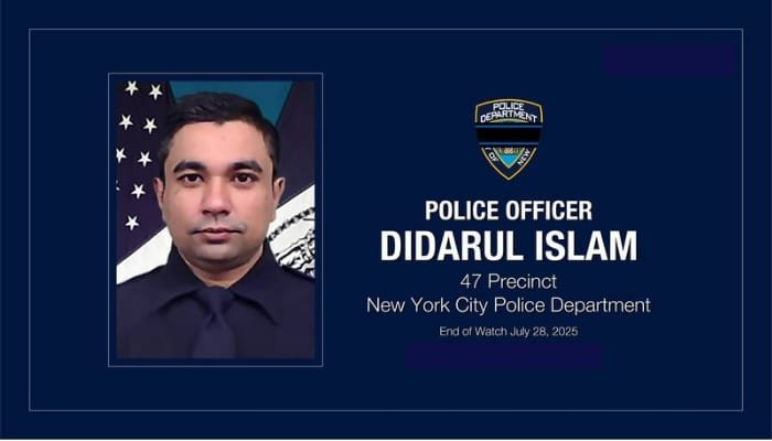 নিজস্ব প্রতিবেদক: নিউইয়র্ক সিটির নিরাপত্তা রক্ষায় কর্তব্যরত অবস্থায় নিউইয়র্ক পুলিশ বিভাগের (এনওয়াইপিডি) কর্মকর্তা দিদারুল ইসলাম সোমবার (২৮ জুলাই) মর্মান্তিকভাবে মৃত্যুবরণ করেছেন। তিনি একজন বাংলাদেশি বংশোদ্ভূত মার্কিন নাগরিক ছিলেন। সাহসিকতা, নিষ্ঠা এবং জনগণের প্রতি অগাধ দায়িত্ববোধের প্রতীক হিসেবে দিদারুল ইসলাম ছিলেন পুলিশের একজন আদর্শ কর্মকর্তা।