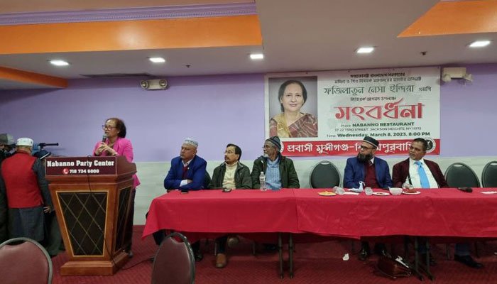 মুন্সীগঞ্জ-বিক্রমপুরবাসী সংগঠনের পক্ষ থেকে সংবর্ধনা প্রদান: যুক্তরাষ্ট্রে বসবাসরত মুন্সীগঞ্জ জেলার প্রবাসীদের মুন্সীগঞ্জ- বিক্রমপুরবাসী সংগঠনের উদ্যোগে নিউইয়র্কে জ্যাকসন হাইটসে নবান্ন রেস্টুরেন্টে প্রতিমন্ত্রী ফজিলাতুন নেসা ইন্দিরাকে সংবর্ধনা দিয়েছে। মো. আক্তার হোসেনের সভাপতিত্বে অনুষ্ঠানে উপস্থিত ছিল মুন্সীগঞ্জ-বিক্রমপুরবাসী ও বাংলাদেশ সোসাইটির নেতারা।