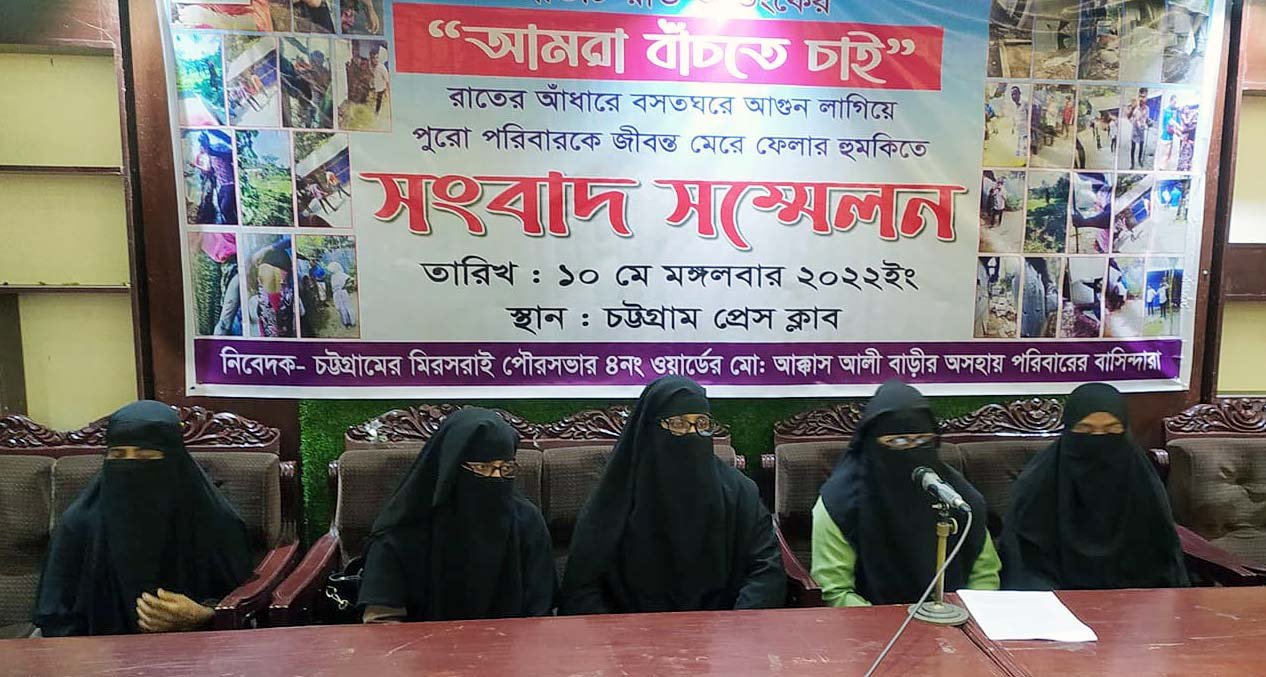 সংবাদ সম্মেলনে কান্না বিজড়িত তিনি বলেন, ‘অপরিচিত লোকেরা রাতের আঁধারে বাড়ির আশপাশে ঘুর ঘুর করায় আমাদের প্রতিটি সন্ধ্যা নামে আতংক নিয়ে। পুরো পরিবারকে আগুনে পুড়িয়ে মেরে ফেলার হুমকিতে প্রতিটি রাত আমরা নির্ঘুম কাটাচ্ছি।’