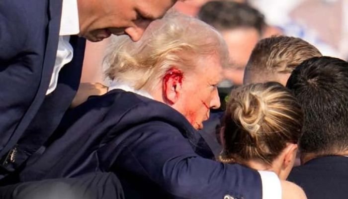 গুলি লাগার পর ট্রাম্প ডান হাত দিয়ে তার ডান কান চেপে ধরেন। এরপর হাঁটু গেড়ে মঞ্চে বসে পড়েন তিনি। দ্রুত ছুটে আসেন সিক্রেট সার্ভিসের সদস্যরা। ঘিরে ফেলেন ট্রাম্পকে।