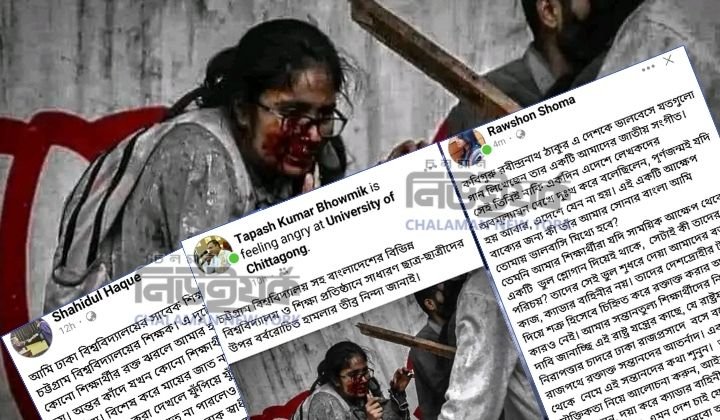 এদিকে যোগাযোগ ও সাংবাদিকতা বিভাগের শিক্ষক মো. শহিদুল হক লিখেছেন, “আমি ঢাকা বিশ্ববিদ্যালয়ের সাবেক শিক্ষার্থী এবং চট্টগ্রাম বিশ্ববিদ্যালয়ের শিক্ষক। এ দুটো বিশ্ববিদ্যালয়ের কোনো শিক্ষার্থীর রক্ত ঝরলে আমার হৃদয়ে রক্তক্ষরণ হয়। অন্তর কাঁদে যখন কোনো শিক্ষার্থীর গায়ে হাত দেয় সন্ত্রাসীরা। বিশেষ করে মায়ের জাত নারী শিক্ষার্থীদের ওপর নির্যাতন করা দেখলে ফুঁপিয়ে ফুঁপিয়ে কাঁদি।
