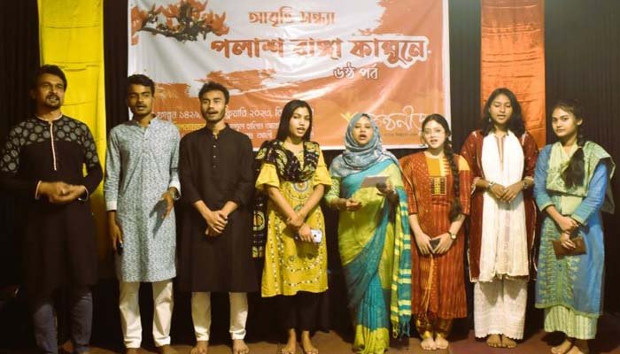 চট্টগ্রাম: ফাগুন মানেই আকাশটাকে মাথায় নিয়ে নানা রঙের প্রজাপতির উড়াউড়ি। ফাগুন হাওয়ায় কৃষ্ণচূড়া আর পলাশের সৌরভে প্রকাশ পায় প্রিয়জনের সান্নিধ্যের অপেক্ষা। ফেব্রুয়ারির ফাগুন শুধু প্রাণ জাগাবার মাস নয়, এ মাসেই মহান ভাষা আন্দোলনের মধ্য দিয়ে রোপিত হয়েছিল বাঙালির স্বাধীনতার বীজ। অংকুরিত হয়েছিল গণতান্ত্রিক অসম্প্রদায়িক বাংলাদেশের। আর এ বিষয়কে উপজীব্য করে বাচিক শিল্প আয়োজন করে ‘পলাশ-রাঙা ফাল্গুনে’ শীর্ষক আবৃত্তি সন্ধ্যার ষষ্ঠ পর্ব। কণ্ঠনীড়ের নিজস্ব মিলনায়তনে শনিবার (২৭ ফেব্রয়ারি) সন্ধ্যা ছয়টায় শুরু হওয়া অনুষ্ঠানে ছিল কথামালা, কবিকণ্ঠে কবিতা পাঠ, একক ও দলীয় আবৃত্তি ও সঙ্গীত পরিবেশনা।