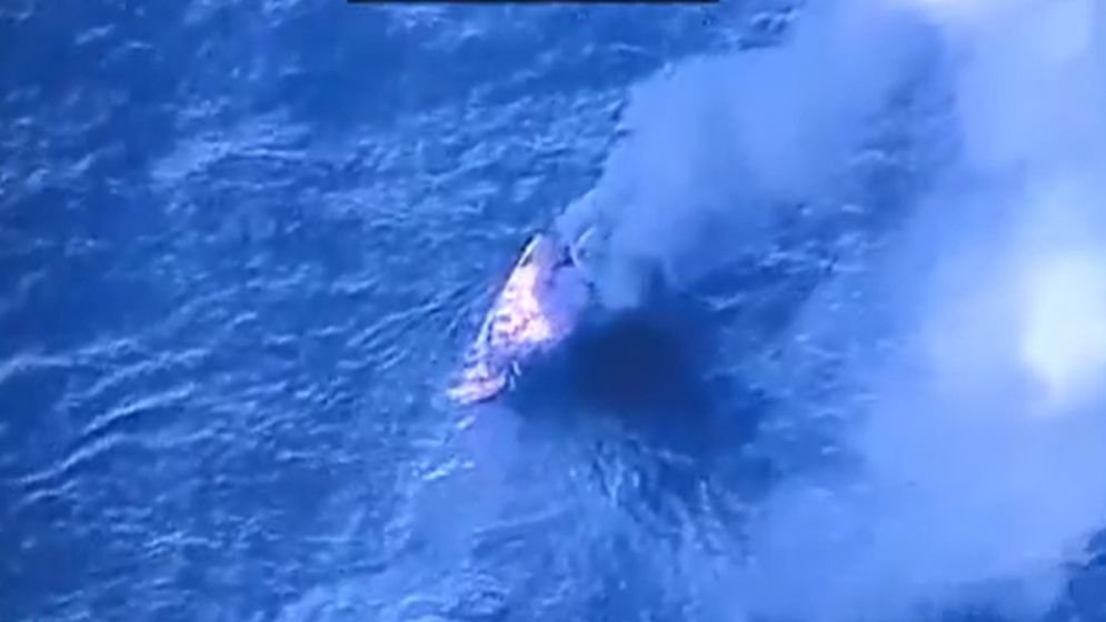 ভিডিওতে দেখা যায়, ঢেউ পেরিয়ে দ্রুতগতিতে চলা একটি ছোট নৌকা হঠাৎ বিমান হামলায় আগুনে পুড়ে ছারখার হয়ে যায়।