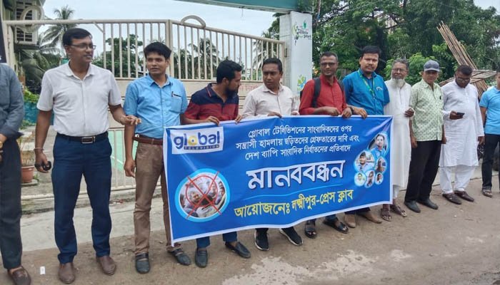 লক্ষ্মীপুর: কুখ্যাত সন্ত্রাসী মুন্না বাহিনী কর্তৃক গ্লোবাল টেলিভিশন এর হেড অফিসে হামলা ও সাংবাদিক নির্যাতনের প্রতিবাদে লক্ষ্মীপুরে কর্মরত সাংবাদিকদের মানববন্ধন ও প্রতিবাদ সভা অনুষ্ঠিত হয়।