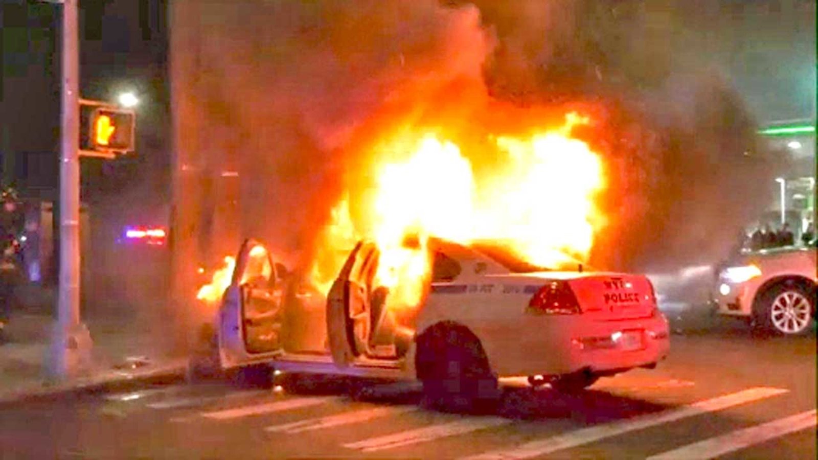 নিউইয়র্ক সিটি পুলিশ জানিয়েছে, পুলিশ অফিসারদের গাড়ি একটি খুঁটির সাথে ধাক্কা দেওয়ার পর গাড়িতে আগুন ধরে এ দুর্ঘটনা ঘটে।