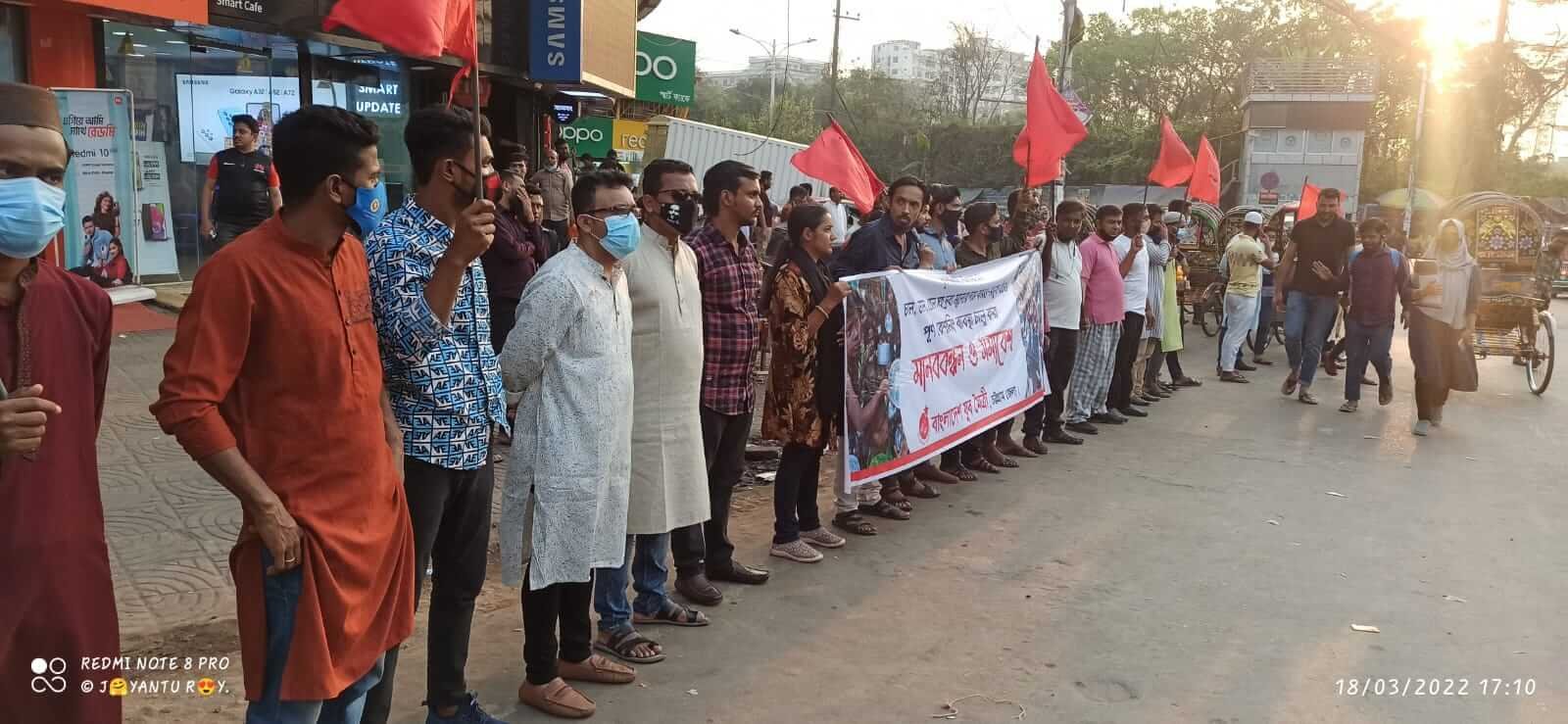 চট্টগ্রাম: চাল, ডাল ও তেলসহ নিত্য প্রয়োজনীয় দ্রব্যমূল্যের ঊর্ধ্বগতির প্রতিবাদে মানব বন্ধন ও সমাবেশ করেছে বাংলাদেশ যুব মৈত্রী চট্টগ্রাম জেলা। শুক্রবার (১৮ মার্চ) বিকালে চট্টগ্রাম সিটির নিউমার্কেট চত্তরে জেলা সভাপতি আবুল মনসুরের সভাপতিত্বে ও শিক্ষা ও গবেষণা সম্পাদক প্রকাশ চক্রবর্তীর সঞ্চালনায় সমাবেশটি অনুষ্ঠিত হয়। এতে বক্তব্য দেন সংগঠনের কেন্দ্রীয় কমিটির সদস্য অরণ্য অনিমেষ, জেলার সাধারণ সম্পাদক আব্দুল্লাহ, সাংগঠনিক সম্পাদক সাইফুদ্দিন সুজন, দপ্তর সম্পাদক ইউনুস ফয়সাল। এতে সহ-সম্পাদক সৈয়দ শিবলী সাদিক, জান্নাতুল আরফা রিংকি, অর্থ সম্পাদক সাইমুনুর রশিদ, জেলা কমিটির সদস্য জয়ন্ত চৌধুরী ও বিভিন্ন থানা কমিটির নেতারা উপস্থিত ছিলেন।
