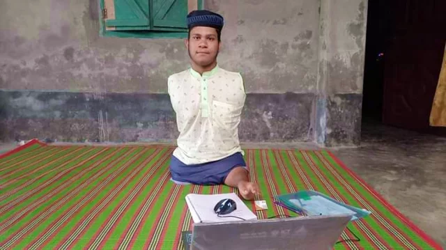 নিজস্ব প্রতিবেদক: দুই হাত নেই। নেই এক পাও। সম্বল বলতে যা আছে এক পা। এই এক পা দিয়ে লিখে এবার দাখিল (এসএসসি) পরীক্ষায় অংশ নিয়েছেন নাটোরের সিংড়া উপজেলার শোলাকুড়া গ্রামের রাসেল মৃধা। অদম্য মনোবল আর ইচ্ছা শক্তি শারীরিক প্রতিবন্ধকতা কোন বাধাই হতে পারেনি এই রাসেলের কাছে। এসএসসি পরীক্ষায় জিপিএ ৩.৮৮ পেয়ে উত্তীর্ণ হয়েছেন রাসেল।