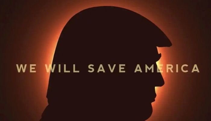 ট্রাম্পের মাথার সাথে ভেসে ওঠে একটি লেখা, ‘উই উইল সেভ আমেরিকা অ্যান্ড মেক ইট গ্রেট এগেইন।’ এরপর ভেসে ওঠে ‘ট্রাম্প ২০২৪’ লেখাটি।