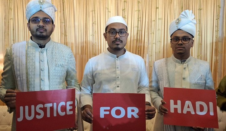 এদিকে বিয়ের মঞ্চে এসএম ফরহাদ ও এজিএস মহিউদ্দীন খান ইনকিলাব মঞ্চের মুখপাত্র শরীফ ওসমান হাদির হত্যার বিচার চেয়েছেন। ডাকসু নেতা এবি জুবায়ের বেশ কয়েকটি ছবি পোস্ট করেছেন যেখানে দেখা যাচ্ছে বরের সাজে ফরহাদ ও মহিউদ্দীন ‘জাস্টিস ফর হাদি’ লেখা লেখা প্ল্যাকার্ড নিয়ে দাঁড়িয়ে আছেন।
