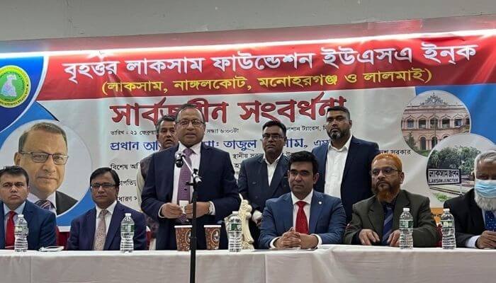 চলমান ডেস্ক: নিউইয়র্কস্থ বৃহত্তর লাকসাম ফাউন্ডেশনের ইউএসএ’র উদ্যোগে লাকসামের কৃতি সন্তান, বাংলাদেশ সরকারের স্থানীয় সরকার, পল্লী উন্নয়ন ও সমবায় মন্ত্রণালয়ের মন্ত্রী মো: তাজুল ইসলাম, এমপি’র নিউইয়র্কে আগমণ উপলক্ষে বর্ণাঢ্য সংবর্ধনা দিয়েছে। গত ২১ ফেব্রুয়ারি সোমবার সন্ধ্যায় এই সার্বজনীন সংবর্ধনার আয়োজন করা হয়। উডসাইডস্থ গুলশান ট্যারেসে আয়োজিত এ অনুষ্ঠানে বৃহত্তর লাকসাম ফাউন্ডেশনের সদস্য ছাড়াও প্রবাসের গণ্যমান্য ব্যক্তি, স্থানীয় রাজনৈতিক নের্তৃবৃন্দ ও মিডিয়া কর্মীরা উপস্থিত ছিলেন।